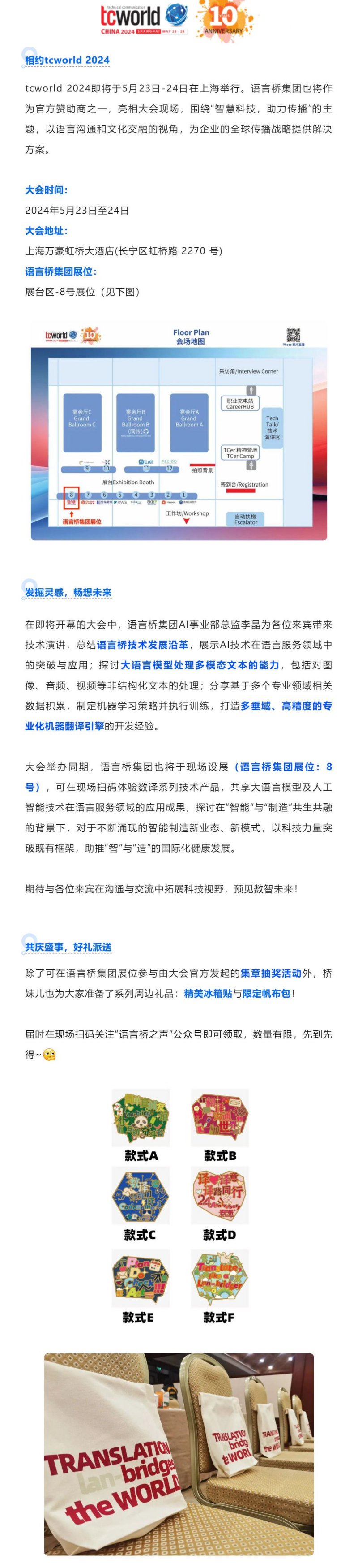 " tcworld 2024即將于5月23日-24日在上海舉行。語言橋也將作為官方贊助商之一亮相大會現(xiàn)場,圍繞“智慧科技,助力傳播”的主題,以語言溝通和文化交融的視角為企業(yè)的國際傳播獻計"...[查看更多]