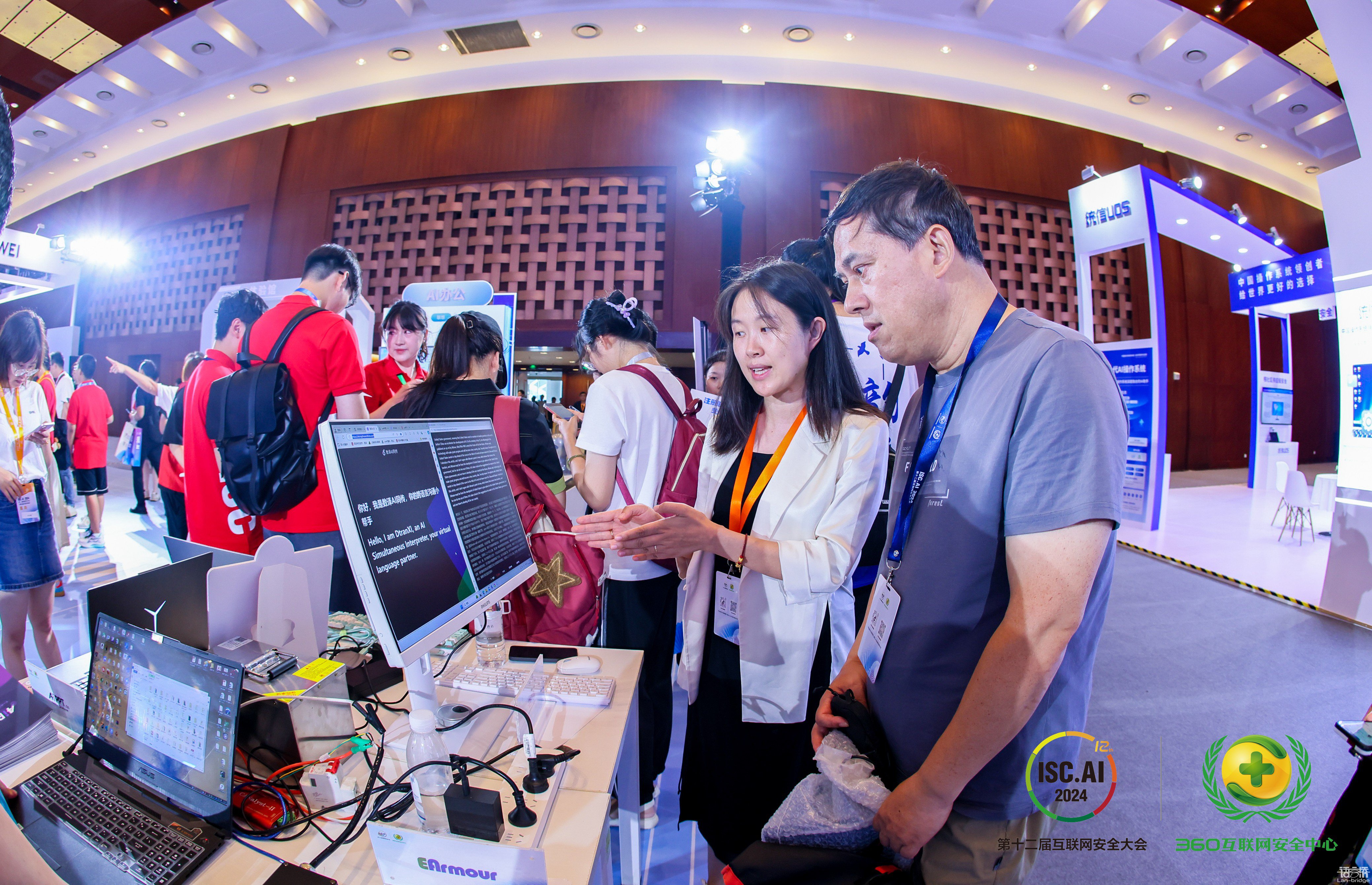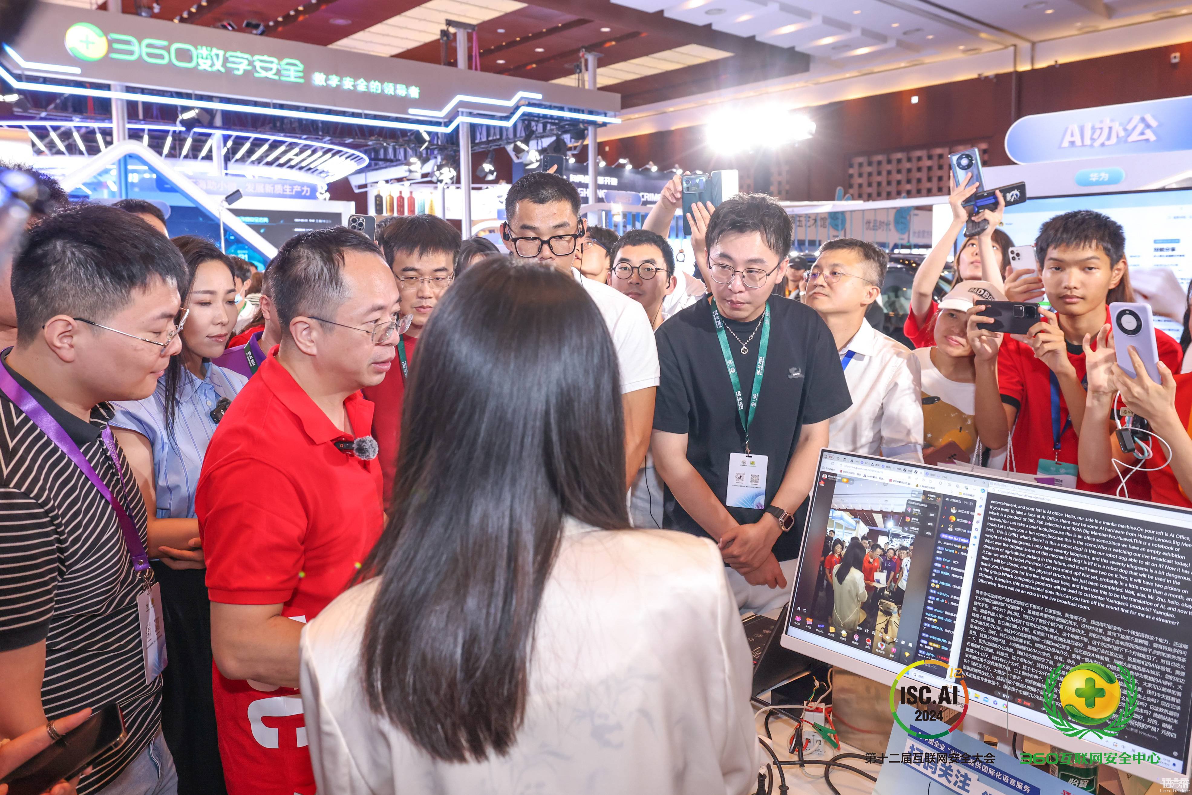 在現場,來自數字安全和人工智能領域的專家及企業代表們對語言橋的翻譯技術產品表現出了濃厚的興趣。360科技集團創始人周鴻祎也在大會的直播中觀看了語言橋的 AI 同傳產品,并與語言橋 AI 事業部李晶總監親切交流。