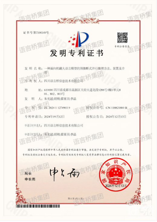 在語(yǔ)言的世界里,我們從未停止探索。全球化的數(shù)字時(shí)代,機(jī)器翻譯(Machine Translation,MT)已經(jīng)成為連接不同語(yǔ)言和文化的橋梁。隨著深度學(xué)習(xí)技術(shù)的迅猛發(fā)展,大語(yǔ)言模型在多語(yǔ)言處理任務(wù)中取得了顯著的進(jìn)展。然而,面對(duì)復(fù)雜多變的語(yǔ)言環(huán)境,如何提升模型的實(shí)時(shí)性和準(zhǔn)確性依然面臨諸多挑戰(zhàn)。本月,語(yǔ)言橋申請(qǐng)的發(fā)明專(zhuān)利“一種面向機(jī)翻大語(yǔ)言模型的預(yù)推斷式并行推理方法、裝置及介質(zhì)“獲得授權(quán),該專(zhuān)利技術(shù)由語(yǔ)言橋自主研發(fā),旨在通過(guò)引入預(yù)推斷token和并行翻譯流程來(lái)提升模型翻譯的效率和準(zhǔn)確性。