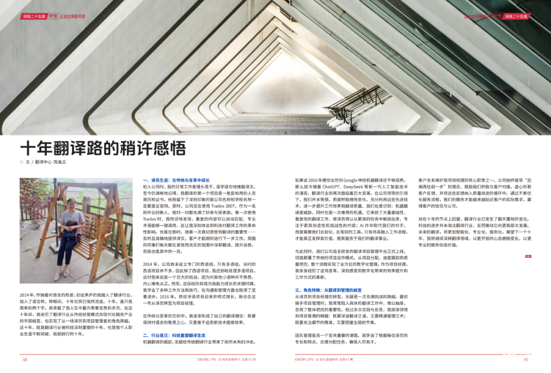 這是她加入翻譯中心的第十年,她說:”這十年,我親歷了翻譯行業(yè)從傳統(tǒng)經(jīng)營模式向現(xiàn)代化服務(wù)產(chǎn)業(yè)的華麗蛻變,是我人生中最為青春寶貴的歲月。“