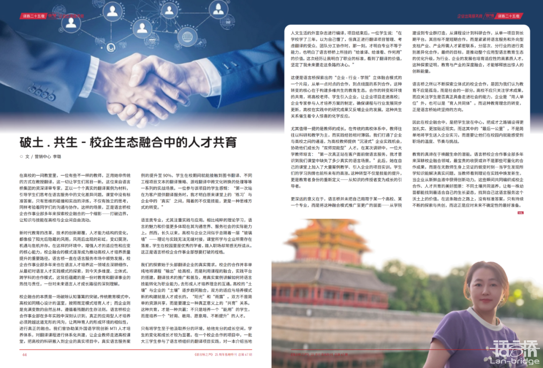 這是她加入營銷中心負(fù)責(zé)校企合作的第八年,她說:“25年來,語言橋一直在語言服務(wù)市場中順勢發(fā)展,從最初對語言人才實踐模式的探索,到今天多維度、立體式、跨學(xué)科的合作模式,這背后蘊藏的是一份對教育和翻譯事業(yè)的熱枕與責(zé)任。”